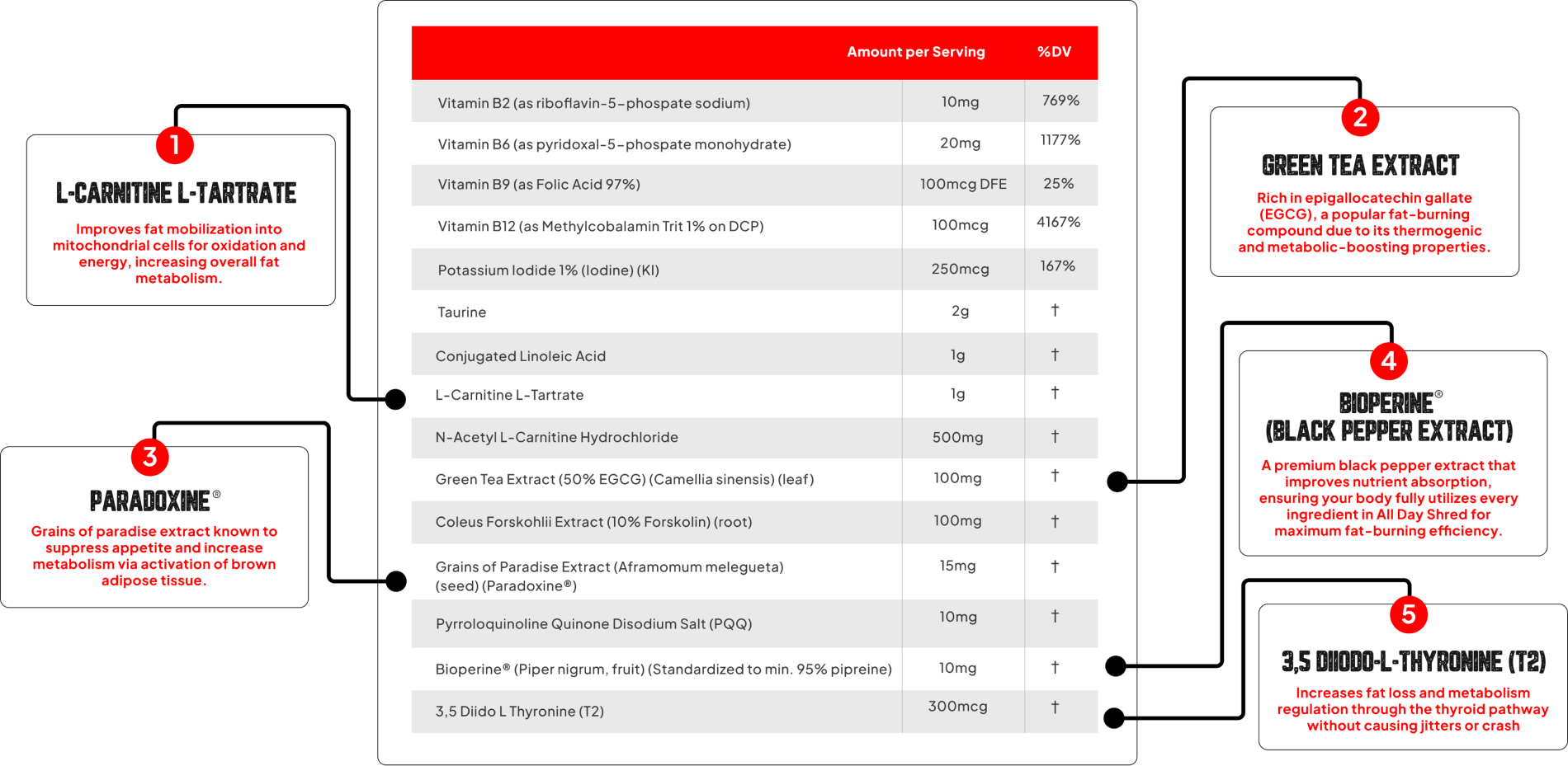 ALL DAY SHRED is a synergistic blend of 15 clinically dosed ingredients with specific benefits for evening use. All day shred contains four synergistic fat loss blends: