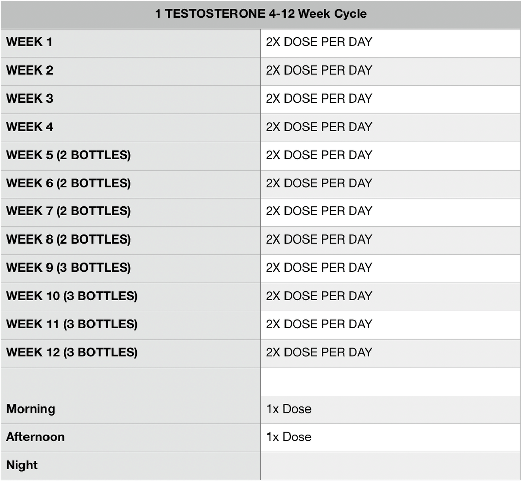 1 Testosterone Can be taked 4-12 Weeks. Each Bottle is 1 4 week cycle. Take 2x Tablets Per day for 4 weeks Minimum. Best Results are 8-12 week range.