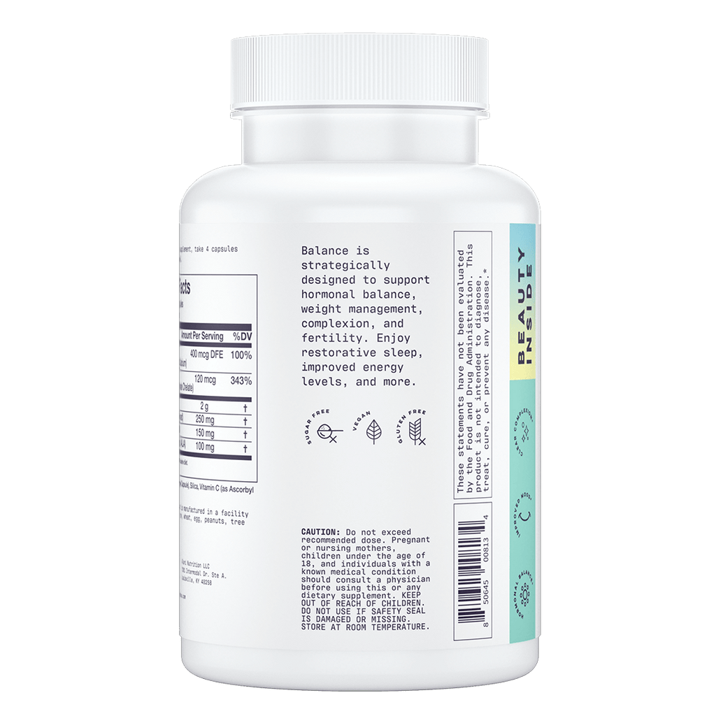 Our 5-star signature supplement, Balance is strategically designed to support hormonal balance, weight management, complexion, and fertility. Enjoy restorative sleep, improved energy levels, and more.