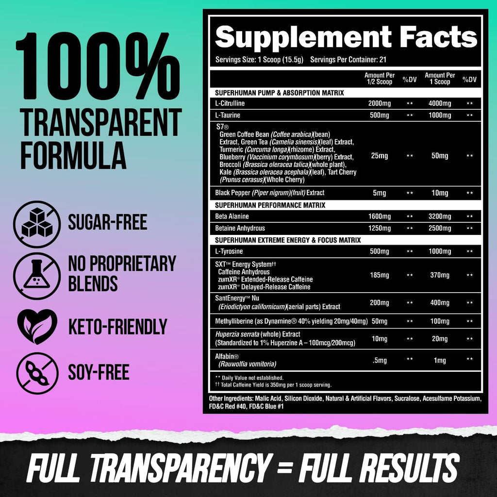 Add these to the already incredible SuperHuman ingredients present and you have an unparalleled MAX DOSED pre-workout experience: