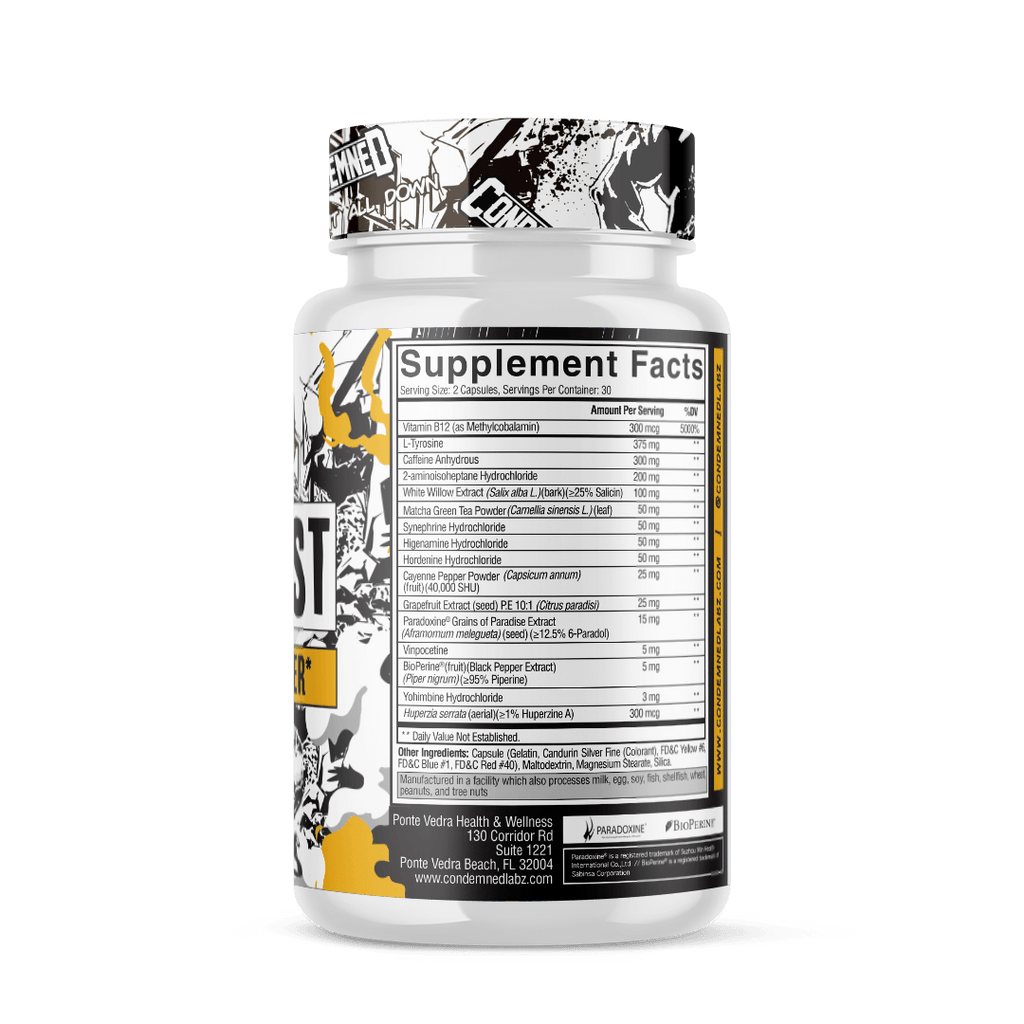 ARSYNIST Fat Burner was created to be an aggressively potent fat burning agent. Condemned Labz designed their fat burner to be geared towards those dedicated individuals trying to cut weight. We loaded this product with proven ingredients along with strong stimulants. You can expect clean energy, which increases metabolism, elevated thermogenesis, which allows calories to be burned easier and appetite control to help curb cravings. The tunnel vision focus supplied will get you through your day and into your training. With Arsyn you won’t experience any crash, shakes or jitters!