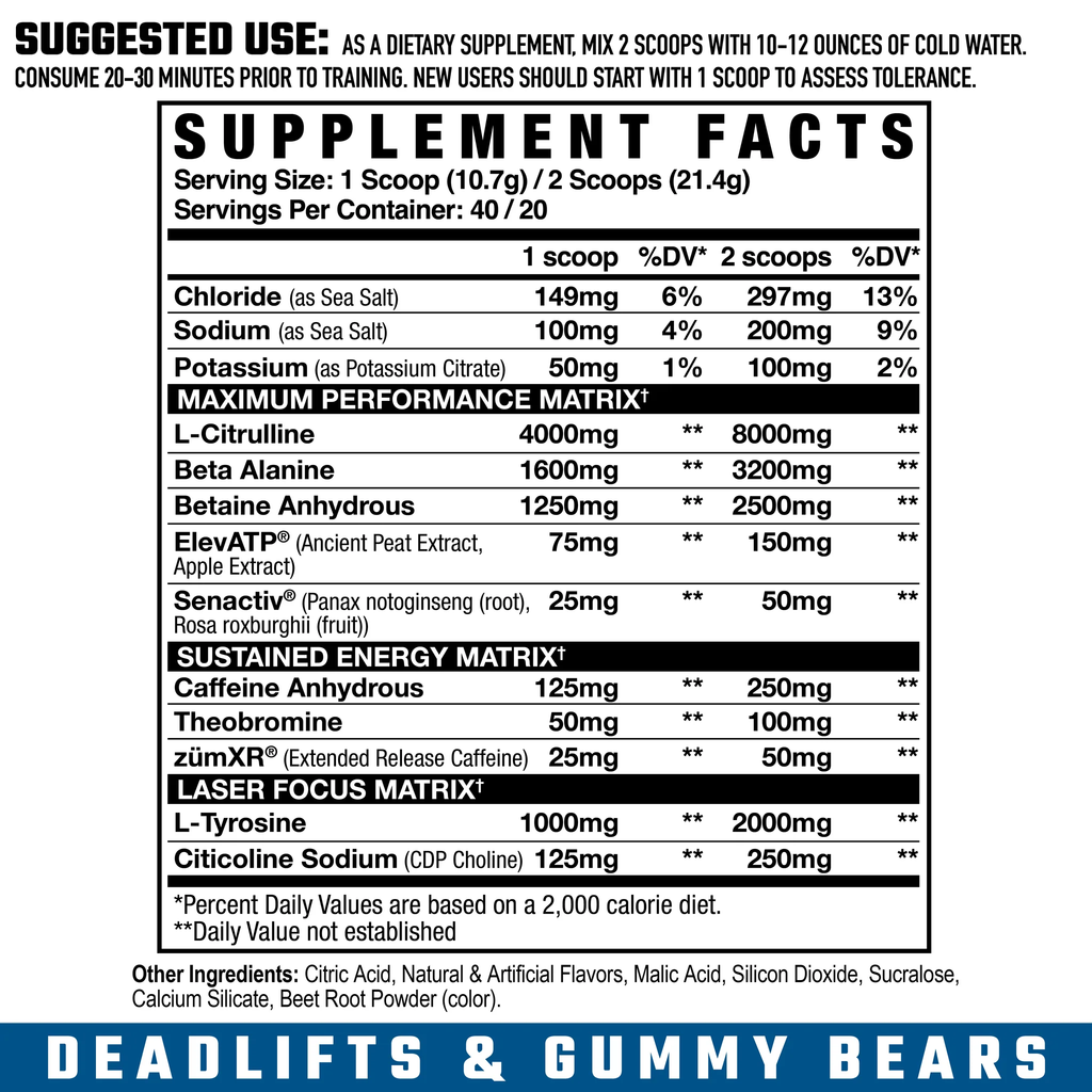 - Label readers who hate prop blends. Fully open so you see exact citrulline, beta-alanine, betaine, caffeine, elevATP®, Senactiv® at 1 or 2 scoops.