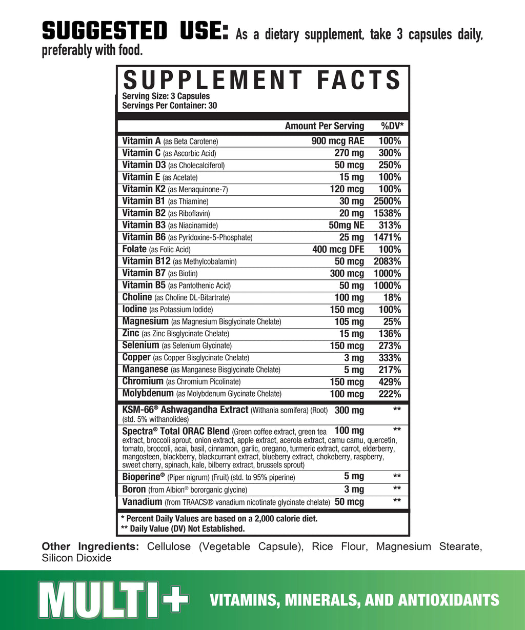 Multi+ contains 24 essential vitamins and minerals in their most bioavailable form. In other words, your body is prime to absorb and utilize these vitamins and minerals so you get the most out of Multi+. We also added Spectra®, a powerful antioxidant blend, KSM-66® Ashwagandha for stress management, and Bioperine® for enhanced absorption.