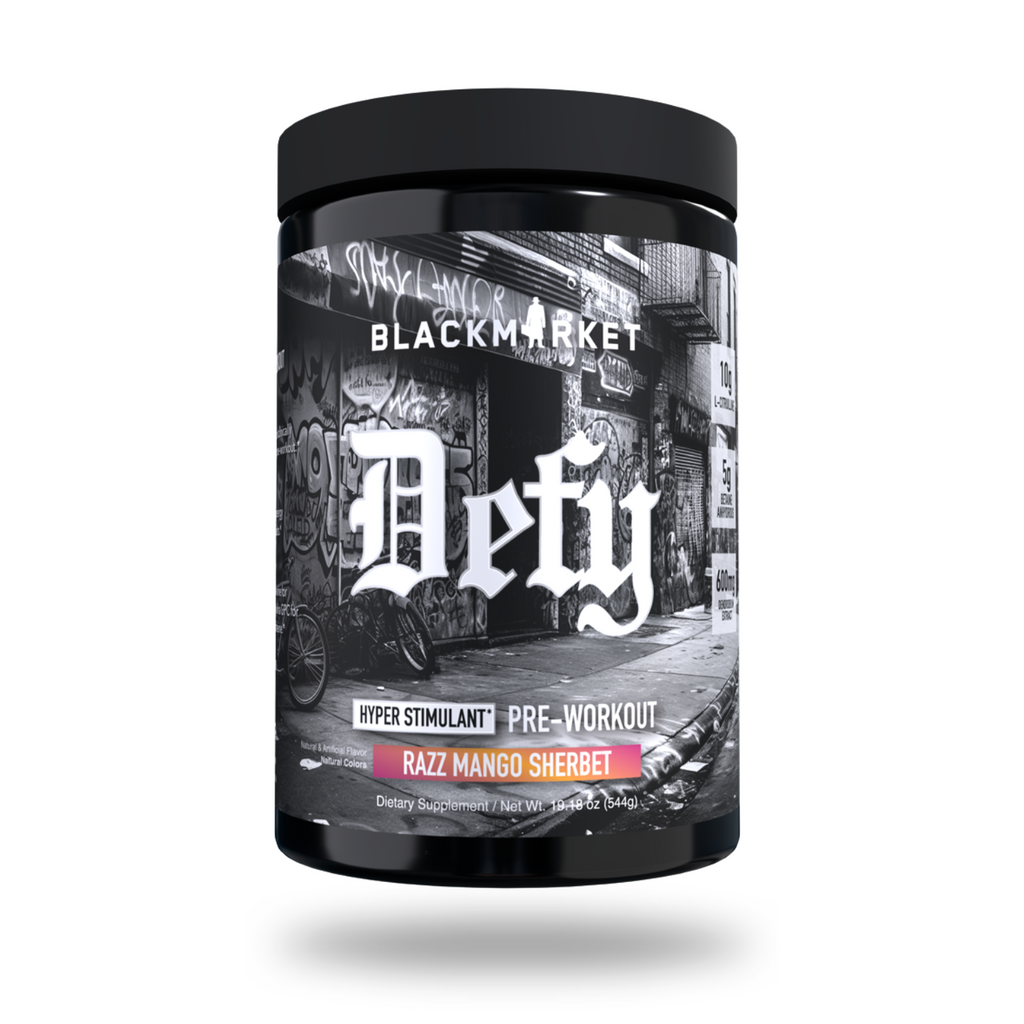 Black Market Lab's first full spectrum pre-workout powder with a 40/20 split serving size. Available in three flavors: Peach Rings, Razz Mango Sherbet, and Watermelon Lemonade. This pre-workout comes stacked with active ingredients and actually feels nice and heavy as you pick up a fresh bottle. Net weight of the pre-workout is over one pound, with forty single scoop servings. Blackmarket groups their supplement facts panel in two categories, pump and performance, and energy and focus. Highlighting some of the key ingredients and their dosages on a single serving scoop below: