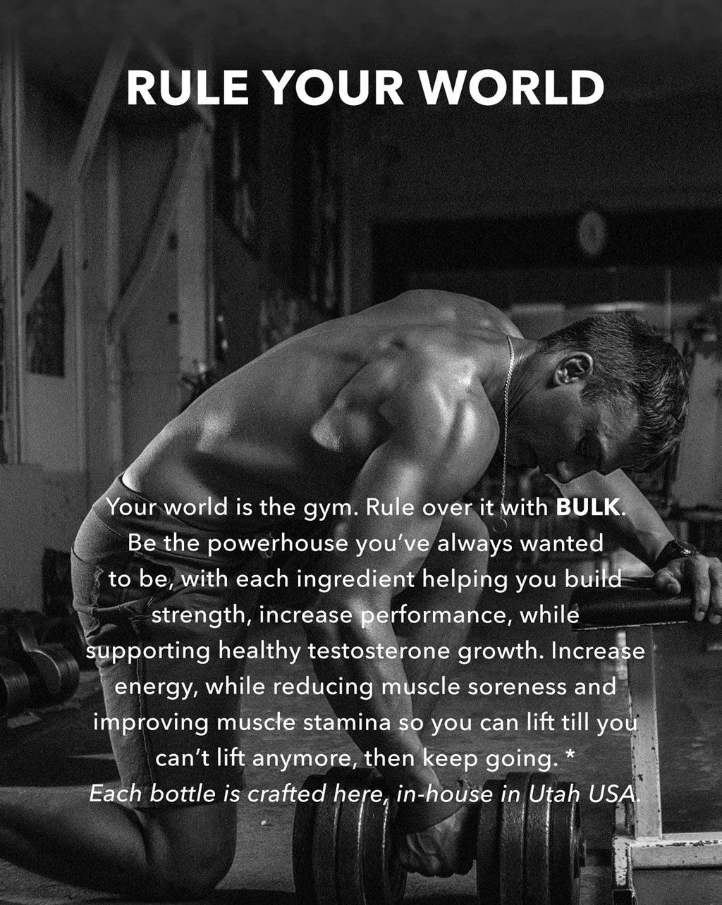 PURPOSE: BULK is one of our most dependable and time-tested pre-workouts, with everything you need for immense power output, strength, and natural testosterone support. Dominate the gym with elevated ATP production, increased energy and focus, with faster muscle recovery. Push more and feel the power.