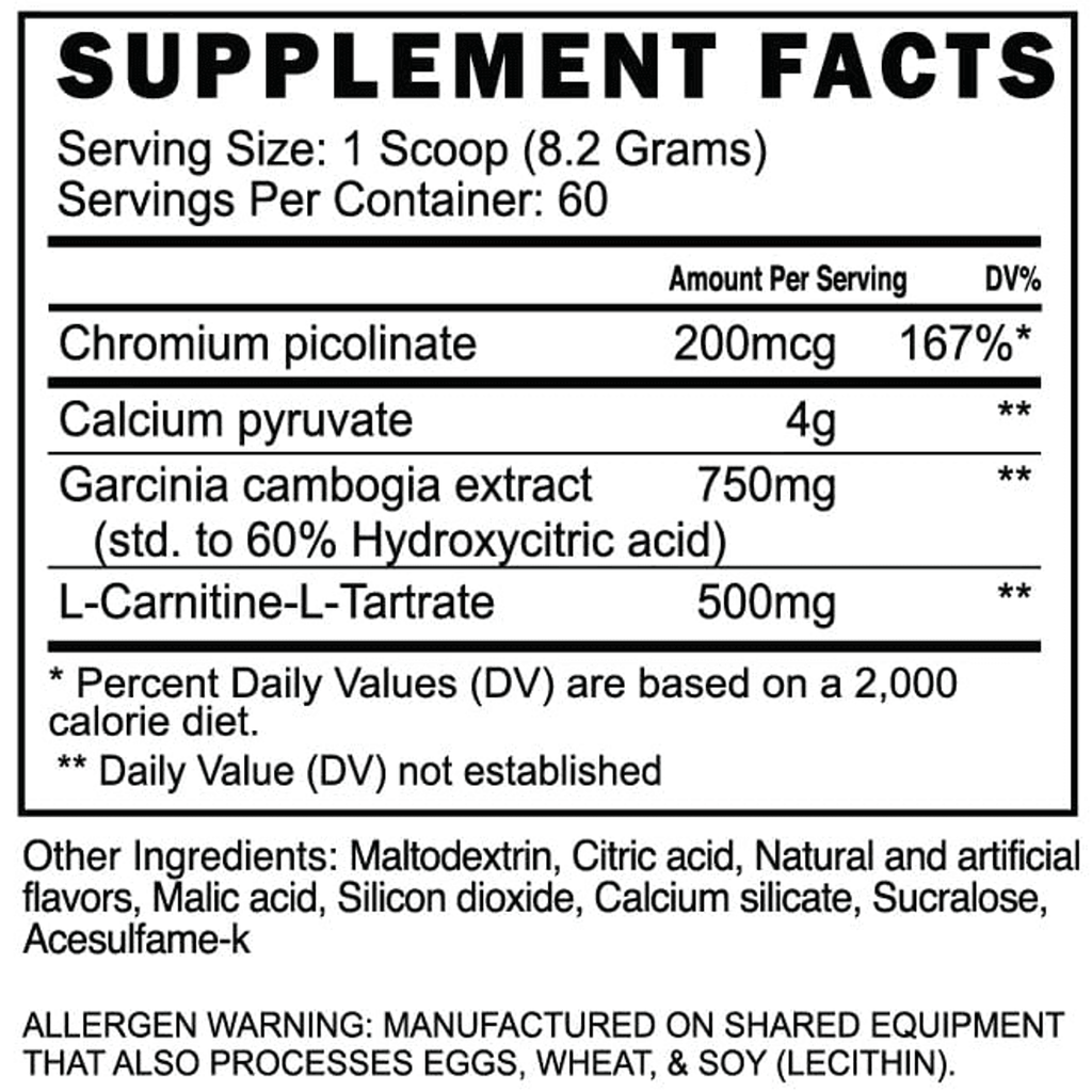 - Everyday fitness folks wanting a clear label over prop blends. This tub shows exactly: 4g calcium pyruvate, 750mg garcinia cambogia, 500mg L-Carnitine L-Tartrate, and 200mcg chromium picolinate, no tricks.