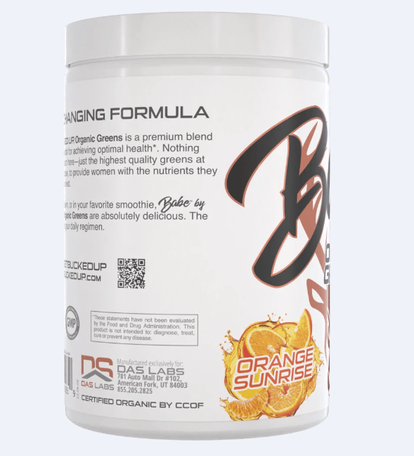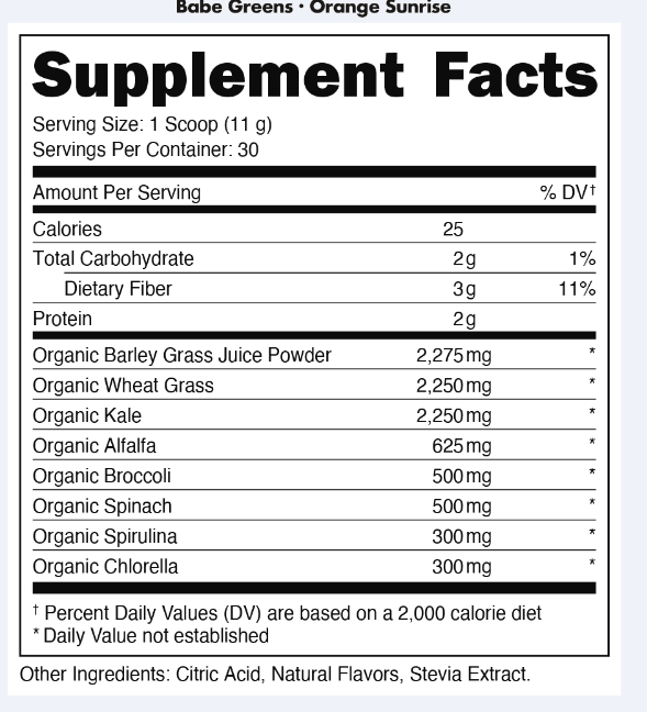 Babe Organic Greens in Sunrise Orange are delicious on their own, or in your favorite smoothie. The perfect addition to your daily regimen.