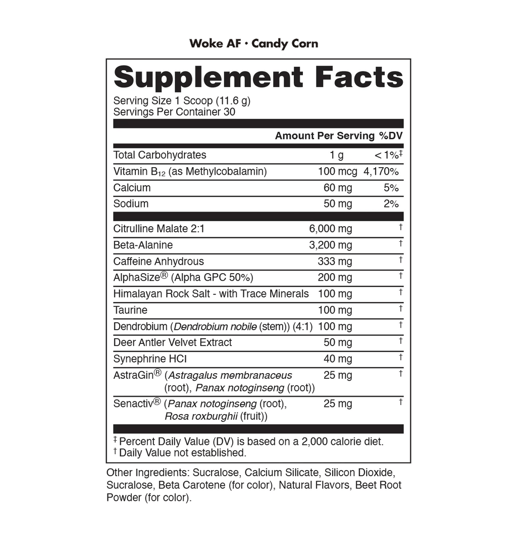 This limited-edition Candy Corn delight isn't just a Halloween treat, it's a power-packed formula that delivers intense focus, strength, and energy.* Fueled by a triple-stimulant blend, Woke AF ensures that even the scariest workouts don't stand a chance against you. This hauntingly sweet flavor will drive you through every rep, setting you up for monstrous gains.
