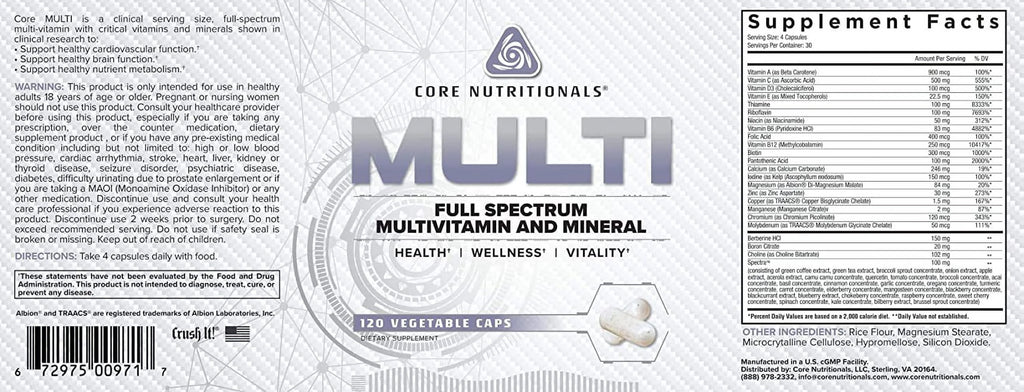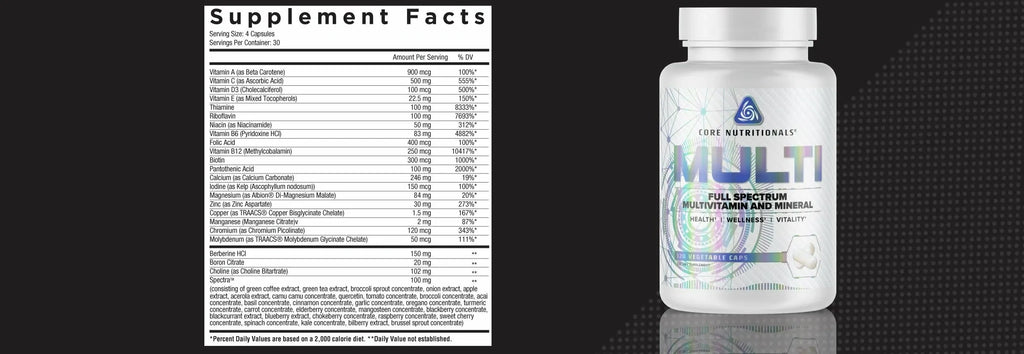 The result is a formula not only with 100% (and often more) of almost all your essential vitamins and minerals, but also a broad-spectrum antioxidant blend antioxidant blend (Spectra™), berberine HCL, and numerous trademarked forms of vitamins and minerals. If you need a broad range of essential vitamins and minerals in sufficient amounts and in the most efficient forms, then Core MULTI is for you.