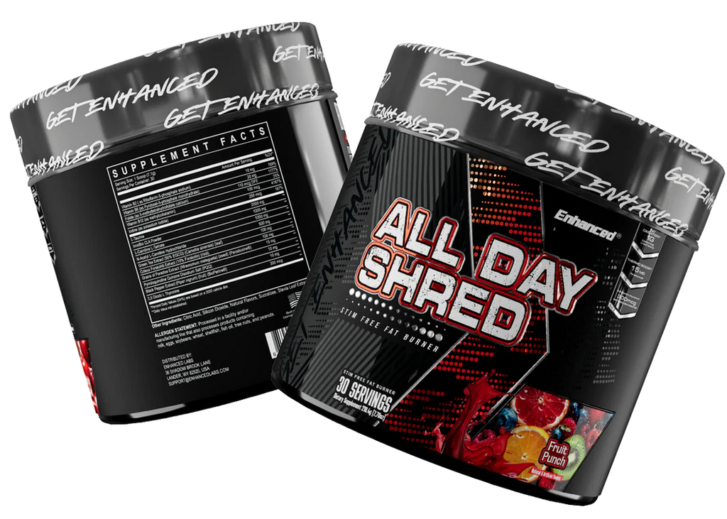 ALL DAY SHRED is a synergistic blend of 15 clinically dosed ingredients with specific benefits for evening use. All day shred contains four synergistic fat loss blends: