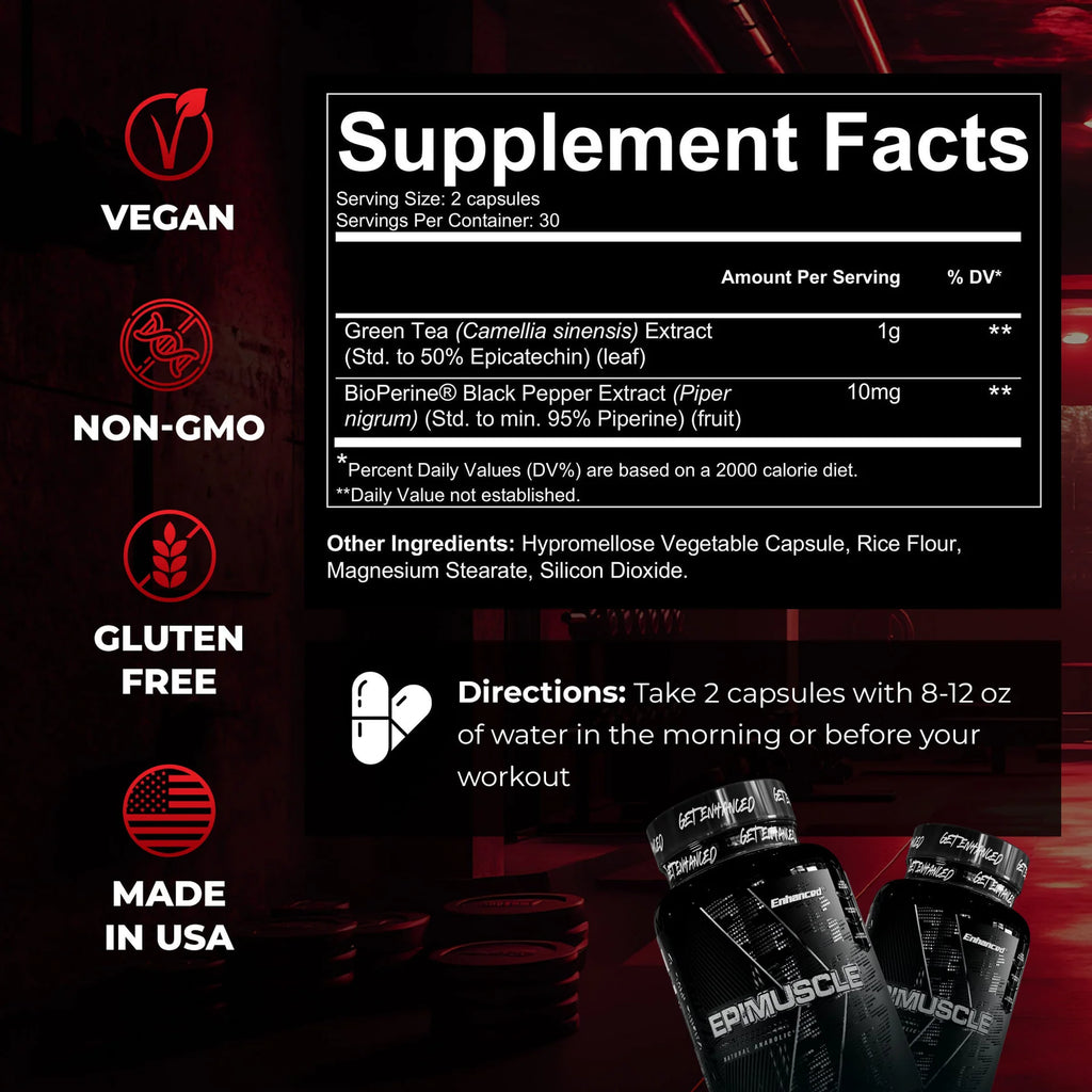 Each capsule of Enhanced Labs EPIMUSCLE contains 250mg of pure Epicatechin.