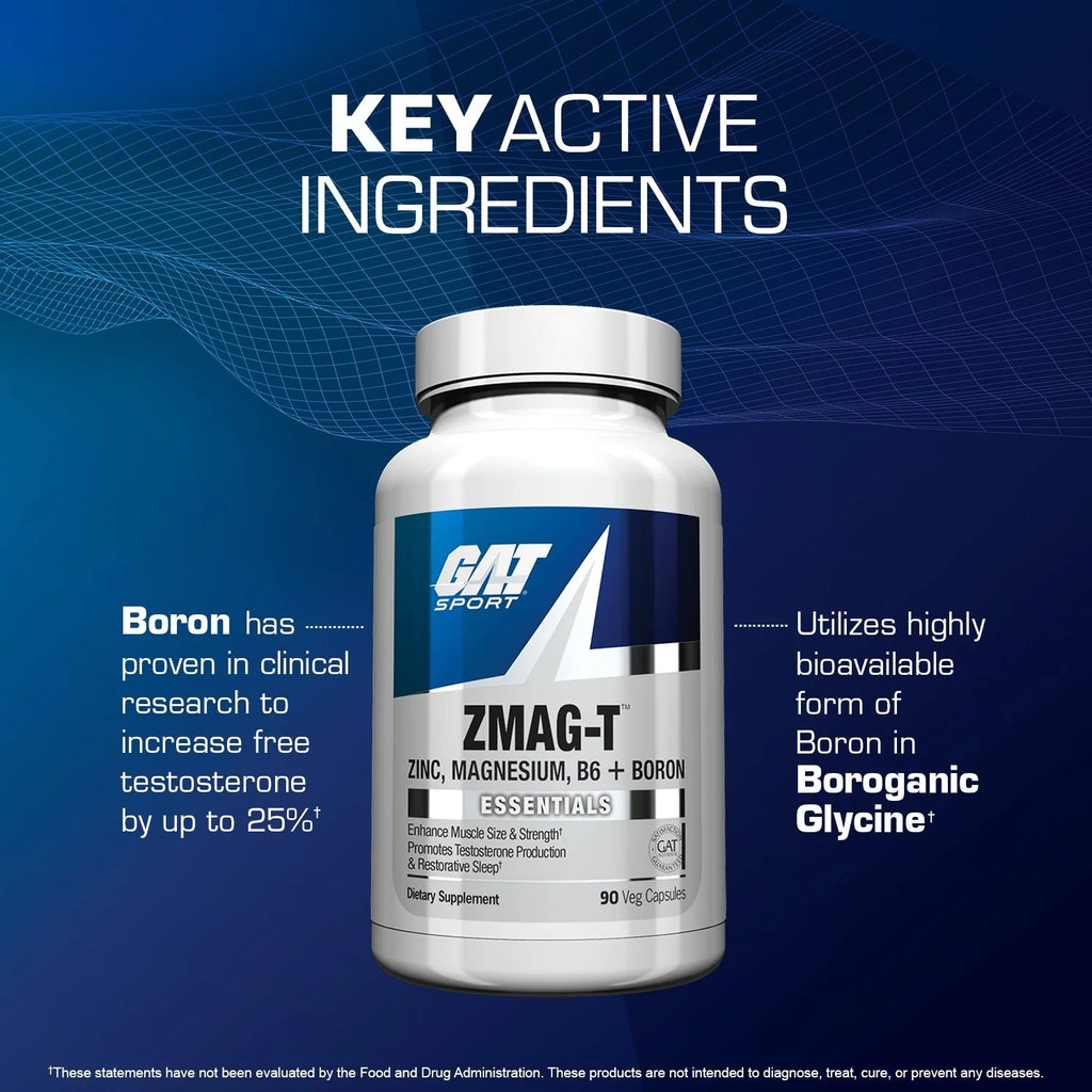 It's essential for all athletes to enhance muscle size and strength, promote testosterone ("test") production, and have restorative sleep. GAT Sport ZMAG-T is a scientifically advanced vitamin and mineral-based nutraceutical designed to help assist with raising testosterone levels and muscle performance all while providing a better night’s sleep.