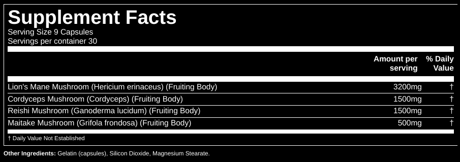 This includes a stacked profile of Lion's Mane, Cordyceps, Reishi and Maitake.