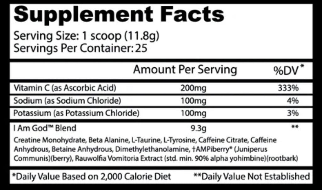 I am God and is formulated to increase strength and give you that much-needed boost of energy to make any workout the best you’ve had. Loaded with a full dose of creatine to increase muscle endurance and size as well as a clinical dose of DMAE and betaine anhydrous to increase energy and focus. If you want a pre-workout that turns you into a greek god, then I am God is the pre-workout for you.