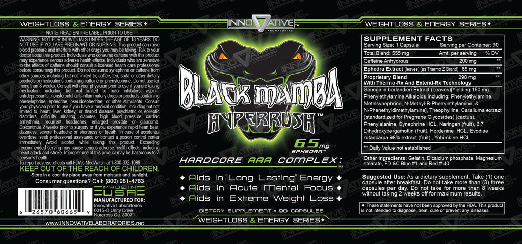 IT’S HARDCORE! The HYPERRUSH is without a question, the most powerful hardcore energizer/weight management product on the market today. While other Diet & Energy aids require you to take 3 to 4 pills to feel even a slight effect… Black Mamba®-HYPERRUSH is so strong, with its Thermo-Rx® brand of Phenylethylamine alkaloids and Thermo-Z® brand Ephedra extract, that all you need to take is ONE and you’ll be AMPED-UP to the max and in HYPERBURN mode to lose weight like you never have before! Even hardcore ephedrine fans who were consuming mega dosages of their beloved ECA stacks per day, consider the effects of this product beyond extreme!