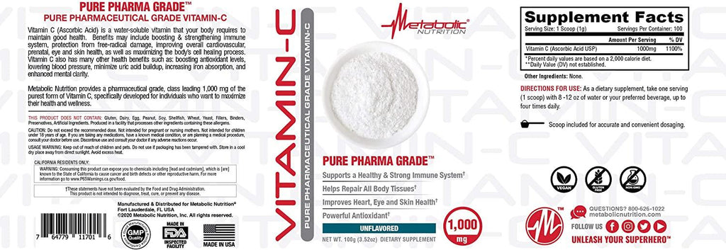 Vitamin-C (AscorbicAcid) is a water-soluble vitamin that your body requires to maintain good health. Benefits may include boosting & strengthening immune system, protection from free-radical damage, improving overall cardiovascular, prenatal, eye and skin health, as well as maximizing the body’s cell healing process. Vitamin-C also has many other health benefits such as: boosting antioxidant levels, lowering blood pressure, minimize uric acid build up, increasing iron absorption, and enhanced mental clarity. Metabolic Nutrition provides a pharmaceutical grade, class leading 1,500 mg of the purest form of Vitamin C, specifically developed for individuals who want to maximize their health and wellness.†