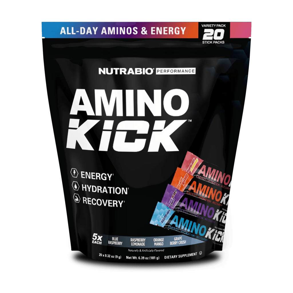 Grab a pack of on the go sticks to kick up the tempo whenever and wherever the day leads you. With the NutraBio Amino Kick Bag, you can recharge, recover, and replenish your body all day, every day.