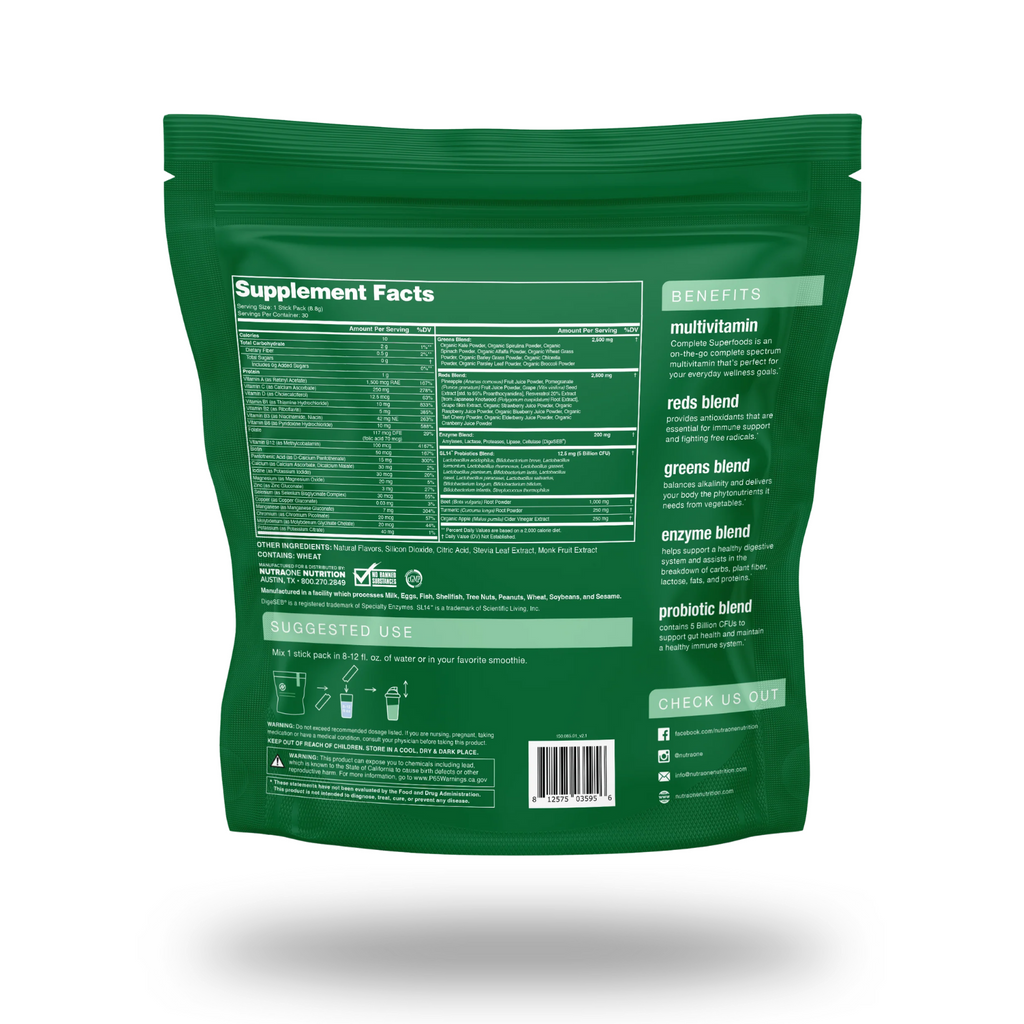 - Whether you’re on-the-go or staying at home, getting your Superfoods has never been easier. Complete Superfoods is available in both a container or convenient stick packs so you can hit your wellness goals wherever you go.*