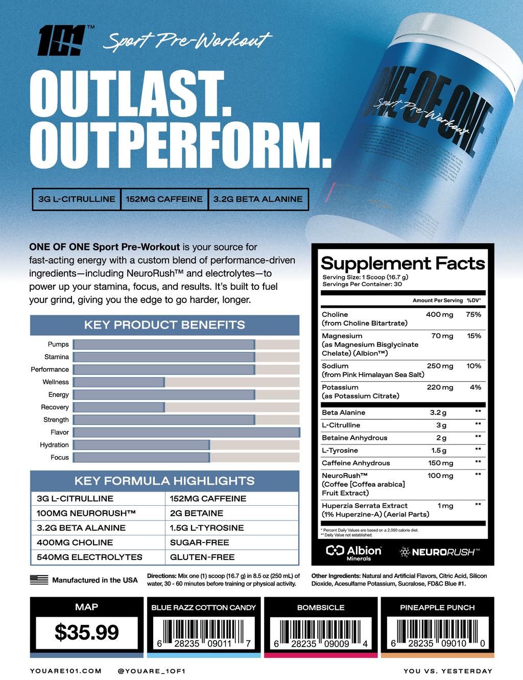 One Of One Sport Pre-Workout sets itself apart from other pre-workouts by utilizing only top-quality, performance-based ingredients for a natural energy boost and effective results.