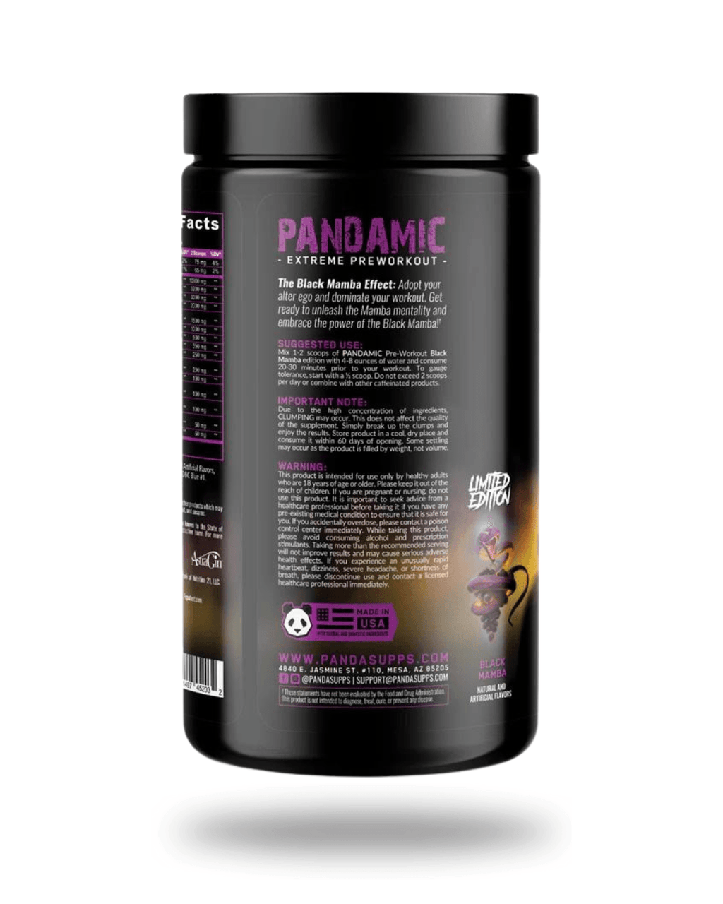 PANDAMIC LIMITED EDITION BLACK MAMBA should be consumed 20-30 minutes prior to any workout or exercise session. Mix 1-2 scoops and mix vigorously in 8-14 oz of water until fully dissolved. Vary the amount of water to achieve your desired flavor level. If you are a first-time user, start with 1/2 to 1 scoop to gauge tolerance.