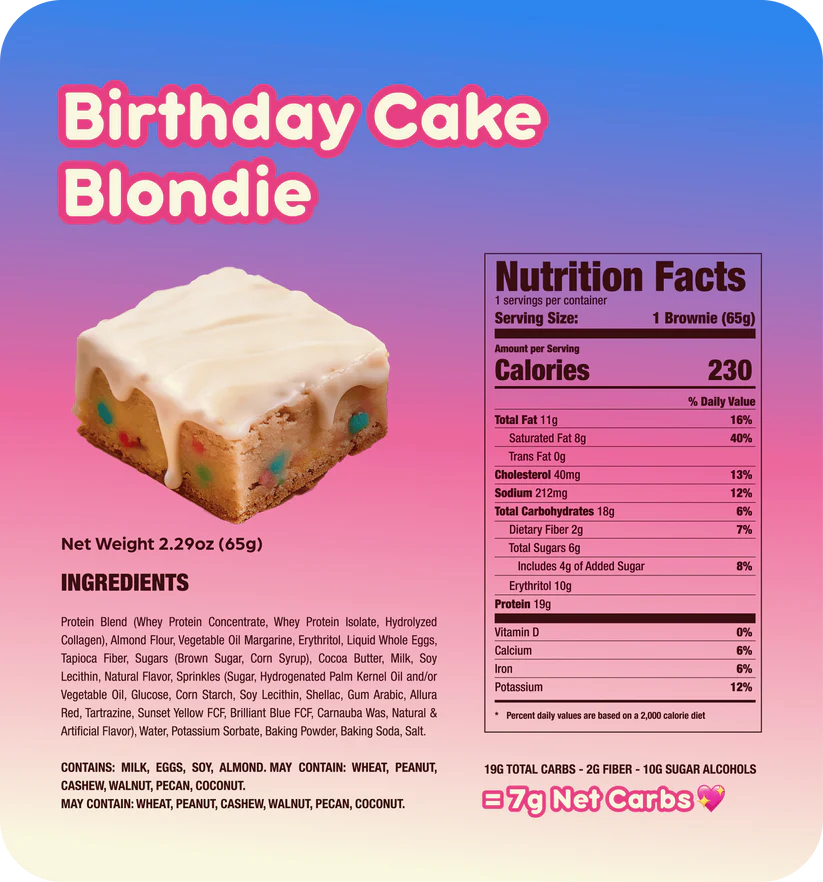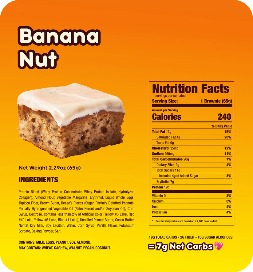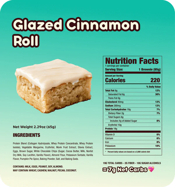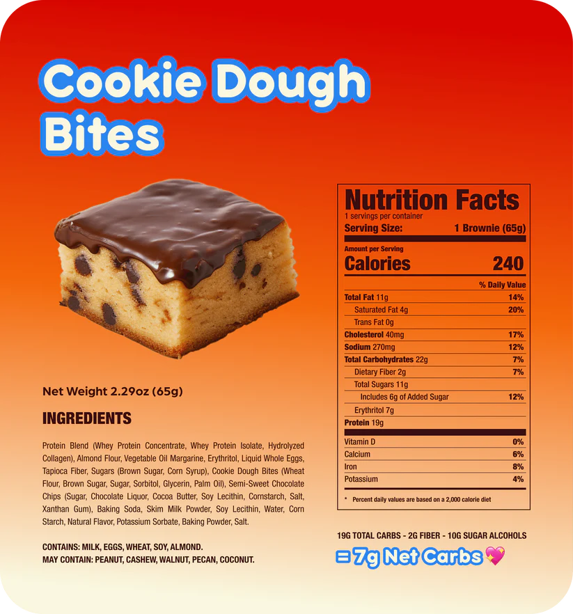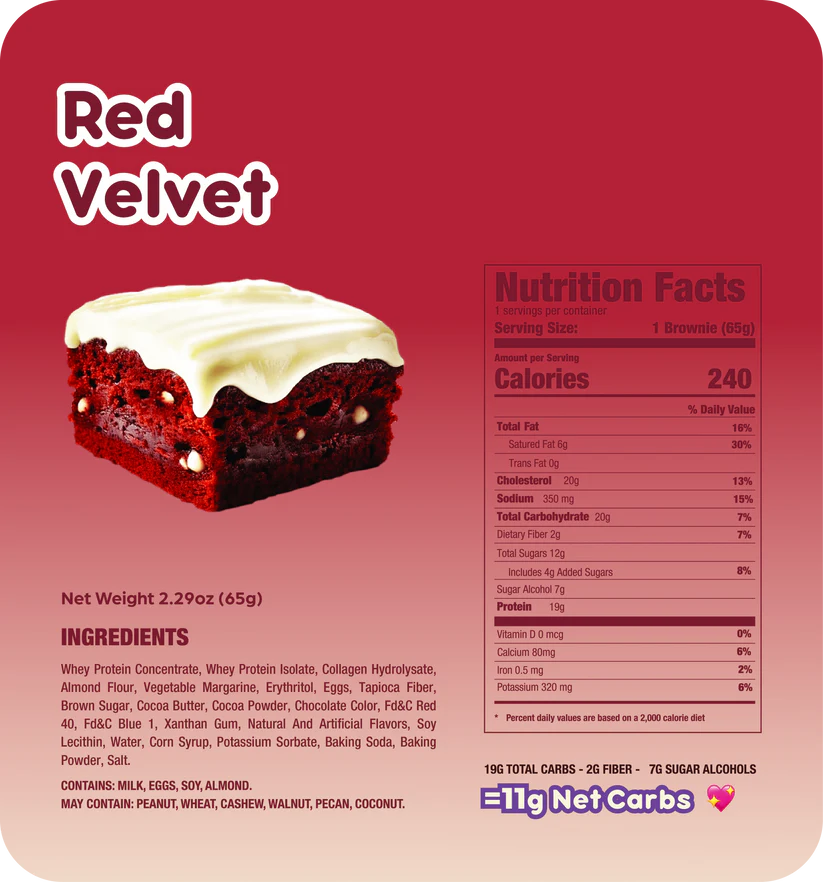Depending on the flavor, the brownie has 20 to 25 grams of carbs and around 200 calories. You also get 16 to 17 grams of 100% whey protein.