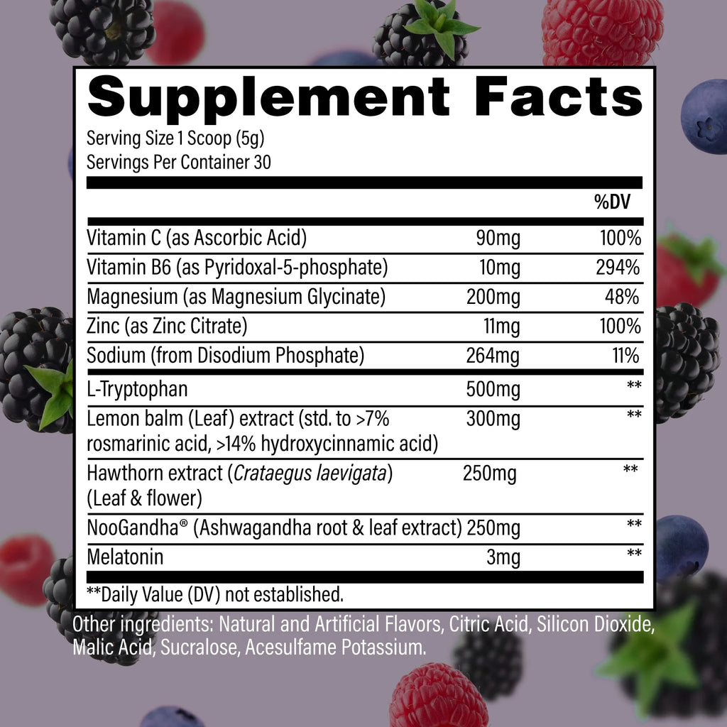 Unique ingredients in RAW Sleep include Lemon Balm extract (std. to >7% rosmarinic acid, >14% hydroxycinnamic acid), Crataegus laevigata (hawthorn) leaf and flower extract, NooGandha®, and melatonin.